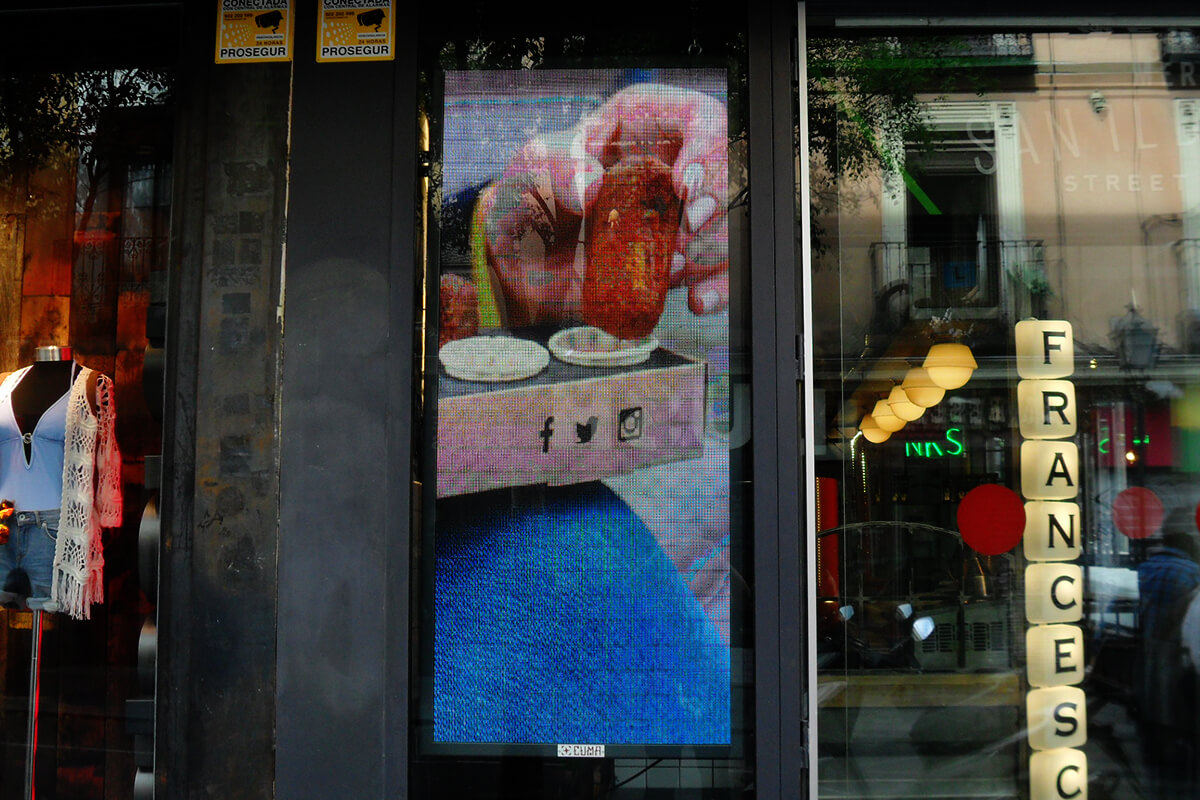 Esta pantalla LED fue instalada en el escaparate del Mercado de San Ildefonso, el primer street food market de Madrid, donde se celebran todas las semanas numerosos eventos en sus más de 18 puestos. Su emplazamiento privilegiado en la concurrida Calle de Fuencarral, hace que esta pantalla LED para escaparates sea el centro de todas las miradas de los viandantes. En ella se ofertan todos los días numerosos platos, menús especiales y próximos eventos que tendrán acogida en sus modernas instalaciones.