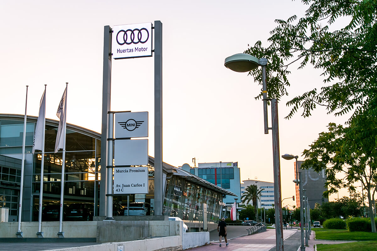 El concesionario AUDI Huertas Motor quiso aprovechar su privilegiada localización en Murcia -plena avenida Juan Carlos I- y promocionar su amplia oferta de automóviles mediante una pantalla LED outdoor p10 Full Color a dos caras. La instalación fue compleja, ya que tenía que integrarse entre dos postes de más de 10 metros de altura, pero el resultado…como se puede ver en las fotos, simplemente genial.