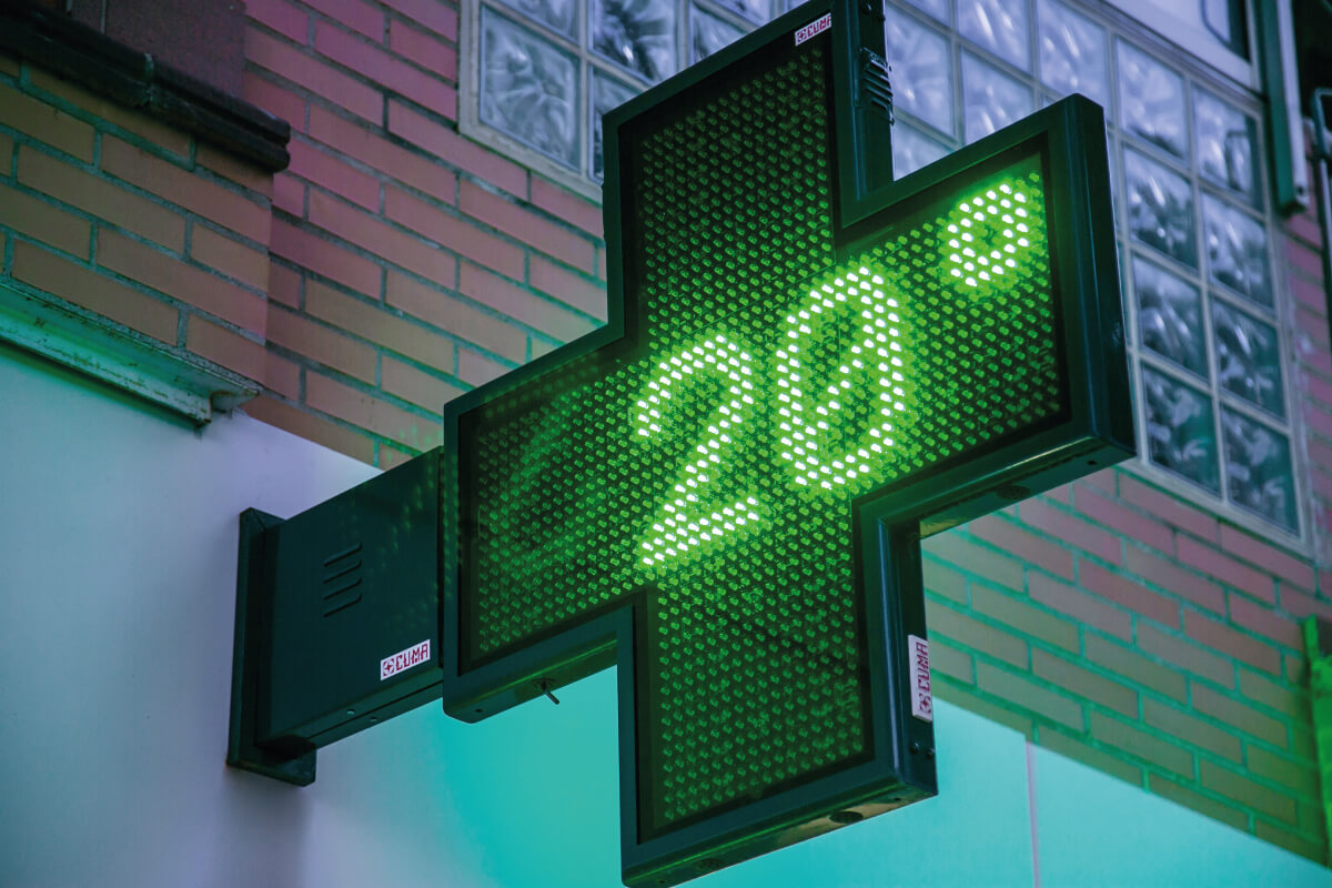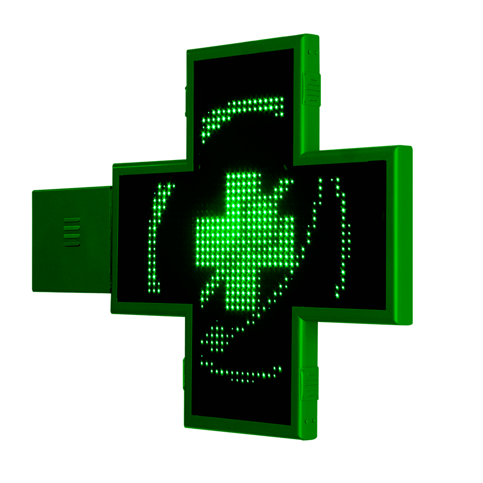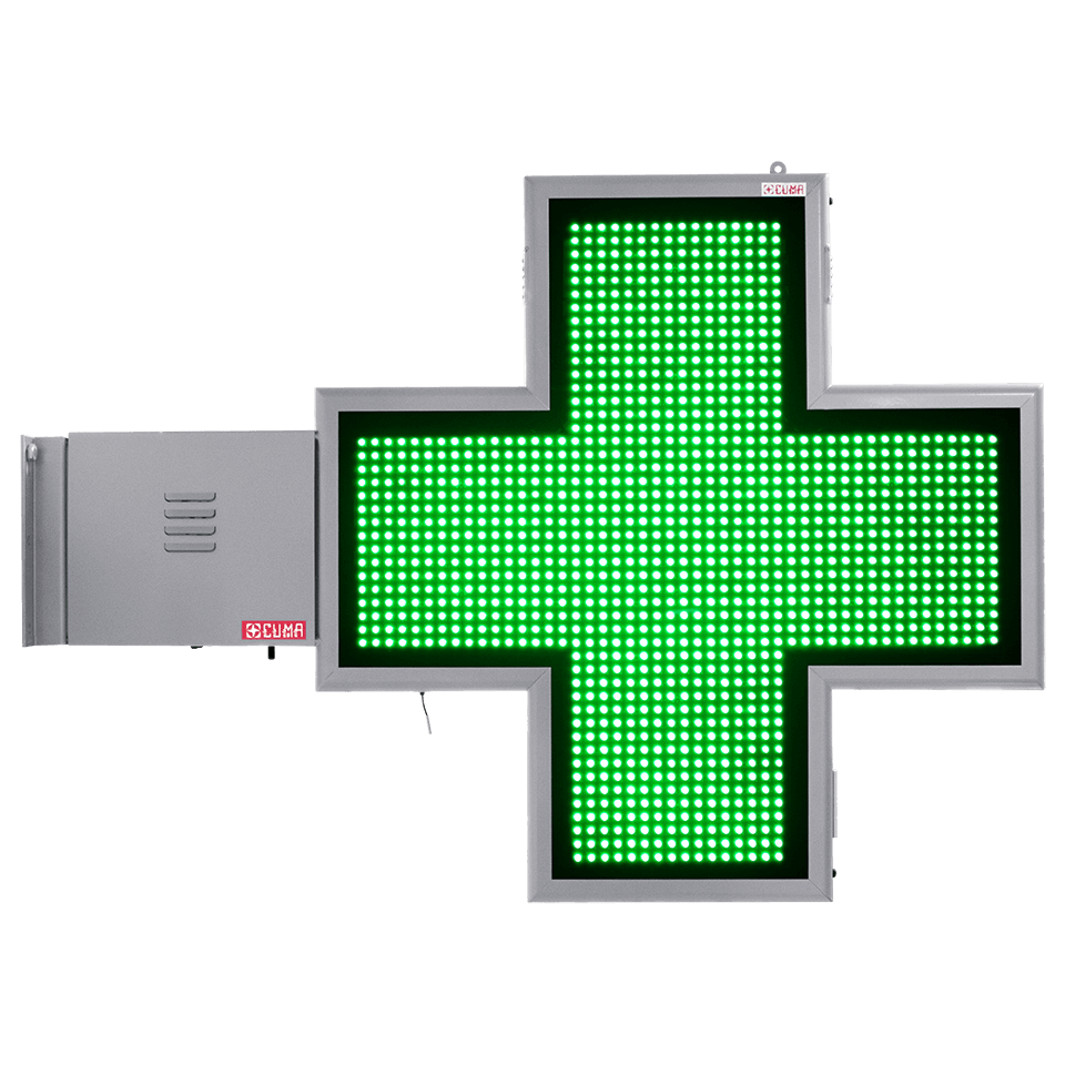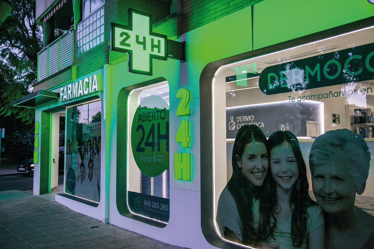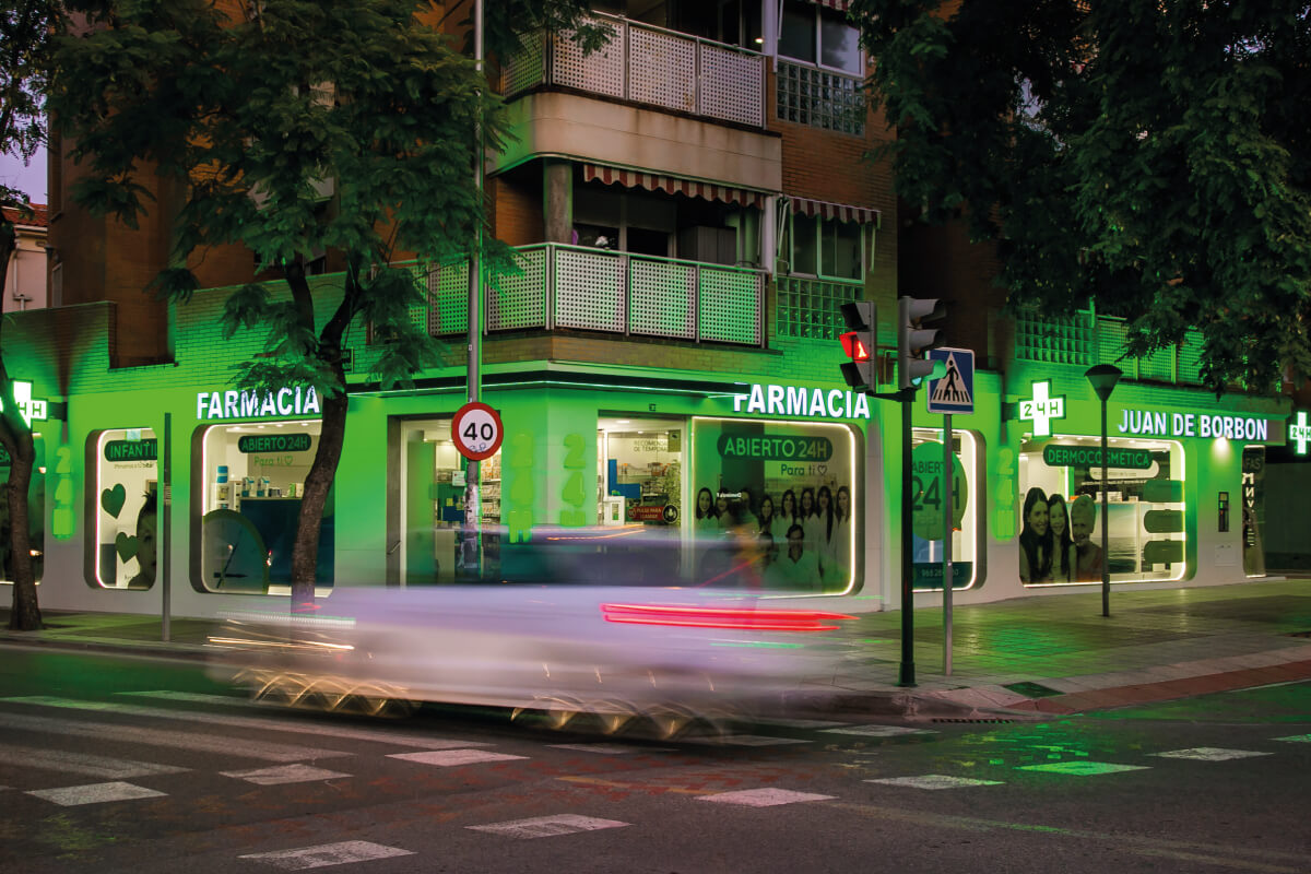 La farmacia Juan de Borbón de la Región de Murcia decidió instalar, junto a sus letras corpóreas, una triple cruz Anzo de CUMA, un producto LED muy demandado en el sector farmacéutico por su estética y prestaciones. Con unas medidas de 867x867x60 mm, esta cruz monocolor cuenta con 2.560 LEDS verdes que desprenden una luminosidad de 26.880 candelas, una potencia de luz única para hacer destacar la fachada de cualquier local. Solo hace falta echarle un vistazo a las fotografías para darse cuenta de ello…
