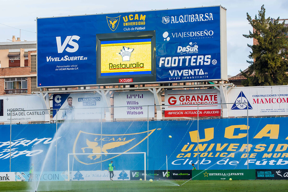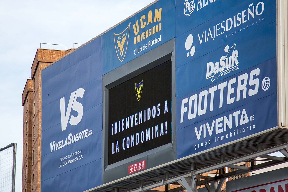 Tras su ascenso a segunda división hace unos años, el equipo de fútbol del UCAM MURCIA decidió instalar en el fondo sur un vídeo marcador (p16) más que imponente para su estadio. Con unas medidas de 5,8 metros de ancho por 3,8 de alto, un elegante y robusto chasis negro; y un LED oval que lo hace brillar de manera única…este marcador deportivo ha celebrado y celebrará muchos de los goles anotados.